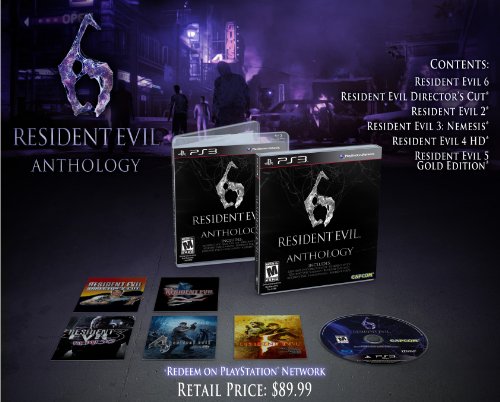 Celebrate the upcoming release of Resident Evil 6 with the complete library of Resident Evil 1-6. Included in this PlayStation 3 exclusive Resident Evil 6 Anthology package is the latest installation of the blockbuster series, Resident Evil 6, along with digital copies of Resident Evil Directors Cut, Resident Evil 2, Resident Evil 3: Nemesis, Resident Evil 4 HD, and Resident Evil 5 Gold Edition redeemable on the PlayStation Network.